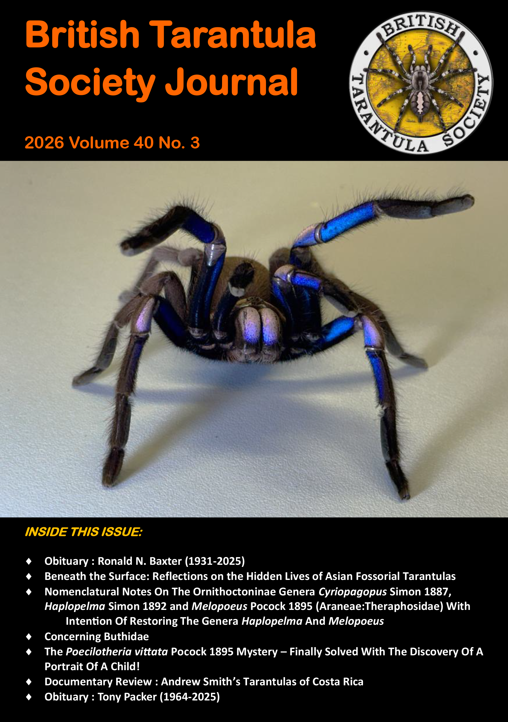 We appreciate your membership in the leading organisation for arachnid enthusiasts. Our Journal of the British Tarantula Society is the finest English-language arachnocultural publication, and we want to give you even more with a bi-monthly newsletter that gives a home to additional features like Letters to the Editor, In Focus, book reviews, art, photo essays, short breeding reports or species overviews and more. We welcome your submissions for both the Journal and the Newsletter. The Editor will decide which publication is best for your contribution. Please feel free to email him at editor@thebts.co.uk.